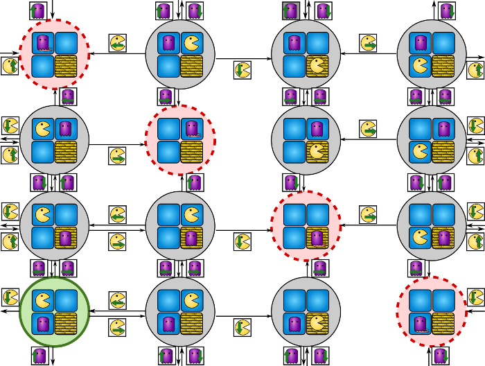 After recursively applying the transformations for moving Pacman and the ghost, the following state space is generated and yields the basis for evaluating cOCL expressions. The state highlighted green in the bottom left corner acts as initial state. The red states with dashed border are end states of the system.